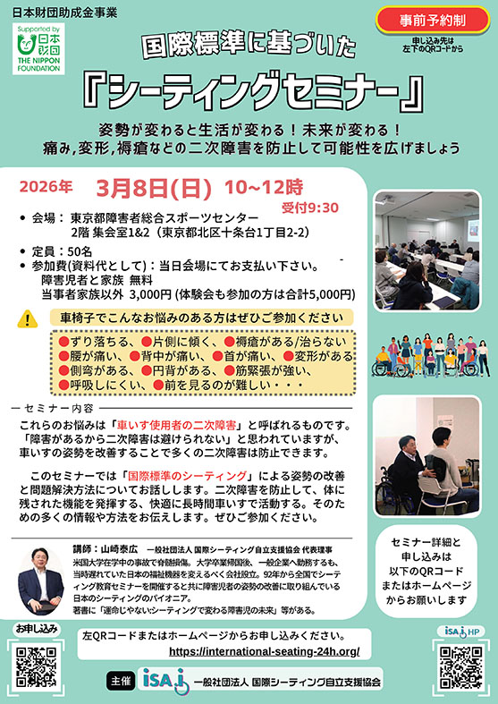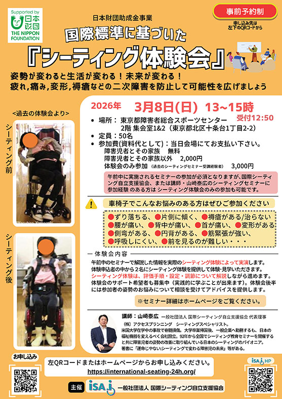 国際シーティング自立支援協会が申請して採択された⽇本財団助成⾦事業「障害児者の姿勢改善による二次障害防止と機能向上に関する啓発」のために、世界中で活用されている国際標準のシーティングによる姿勢の改善・二次障害の防止・機能性向上に必要な姿勢とシーティングの基礎が学べるセミナーを開催します。同日の午後には、実際に姿勢の悩みのある障害当事者の方の姿勢の評価から‧シーティング体験までを実演する体験会を同じ会場で開催します。